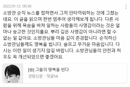 나는 장애인의 이동권 보장 문제, 코로나 이후 추위와 배고픔에 더 취약해진 사람들, 평택 화재로 인한 소방관 순직, 광주 아파트 붕괴 사고 등을 다룬 기사나 칼럼을 읽고 댓글을 썼다. 예전에는 이런 뉴스를 접하면 잠시 안타까워하는 것에 그쳤다.