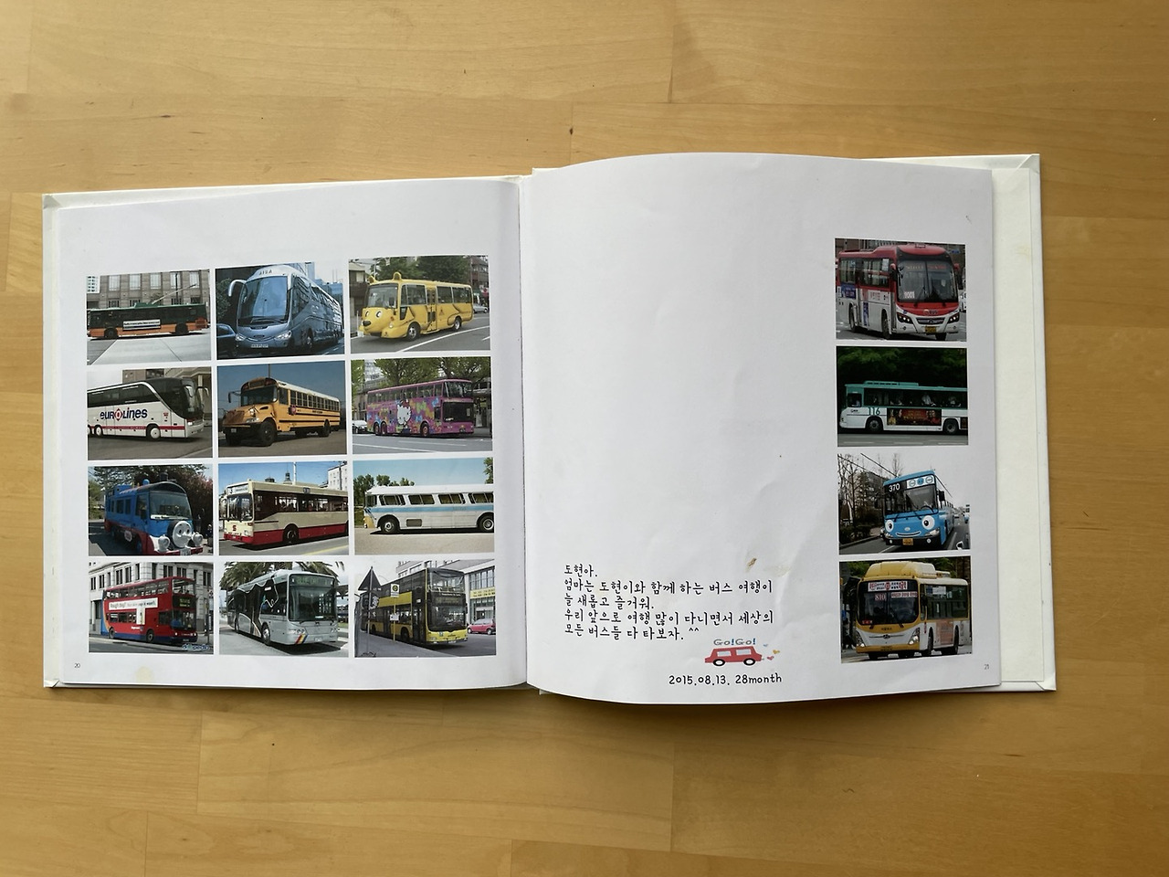 두 번째 그림책에는 버스를 좋아하는 아이의 하루 일과를 담았다. 버스에 푹 빠진 아이 때문에 우리는 매일 같이 버스를 타고 여기저기를 돌아다녔다. 책에는 아이가 버스를 종류별로 다 타보고 싶어 해 버스를 세 번씩 갈아탔던 일, 버스를 기다리는데 정류장 뒷산에서 바람이 불어 나무 냄새가 나자 “엄마, 수박 냄새나요.”라고 했던 아이의 말 등이 담겨있다. 책 맨 뒷장에는 부록처럼 세계의 다양한 버스 사진을 찾아 실어 놓았다. 아이가 이 책을 처음 읽고 나서 지었던 표정을 잊을 수가 없다. 이 책은 아이가 세상에 태어나 가장 재밌게, 가장 많이 읽은 책이 되었다.