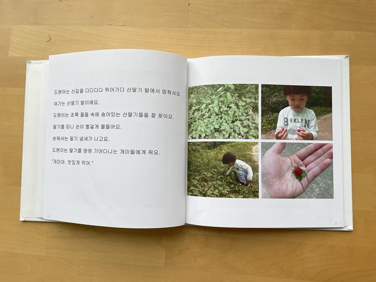 나는 그림책을 인터넷의 포토북 사이트를 활용해 만들었다. 책을 만들 때 종이 여러 장을 스테이플러로 툭툭 찍어 가볍게 만들 수도 있었지만 진짜 책과 크기, 모양, 질감 등이 최대한 비슷한 책으로 만들어주고 싶었다. 컴퓨터는 한글 프로그램만 다룰 줄 아는 나도 사이트 내의 편집 프로그램을 이용하면 어렵지 않게 제법 근사한 책 한 권을 만들 수 있었다.