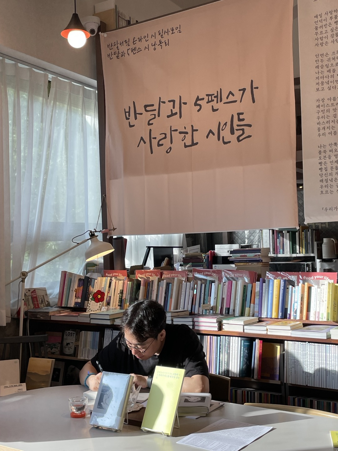 낭독회를 시작하기에 앞서 서점지기는 반달과 5펜스 회원들이 시인에게 갖는 남다른 애정을 전하며 한 회원의 ‘고노랑 적금’에 대해 소개해주었다. 고노랑 적금이란 고명재 시인에 관한 여러 가지 항목을 만들어 그에 해당될 때마다 일정 금액을 저금하는 것이다.