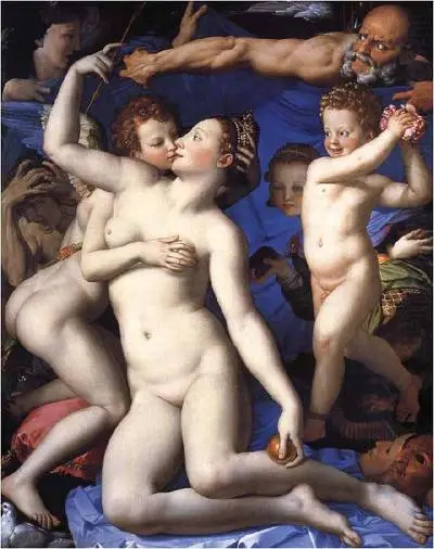작품 왼쪽 중앙에 위치한 활을 메고 날개 달린 소년은 큐피드를, 황금사과를 손에 들고 머리에 왕관을 쓴 여인은 비너스를 의미한다. 신화 속에서 사랑을 관장하는 두 신은 육체적 사랑을 상징하고 있다. 이들 바로 뒤에서 달려오는 소년은 쾌락과 유희를 뜻한다. 소년은 짓궂은 표정으로 두 모자에게 장미꽃을 던지려 하지만 그 발을 자세히 들여다보면 가시에 찔려 피가 나고 있다는 사실을 알 수 있다. 이는 곧 육체적 사랑에 눈이 멀어 고통조차 잊고 쾌락을 향해 달려가는 사랑의 이중적인 모습을 의미한다. 소년 뒤에는 괴물의 몸을 하고 있는 무표정한 소녀가 서 있는데, 이 소녀의 이름은 기만이다. 소녀의 왼손에는 사랑의 달콤함을 뜻하는 벌집이 쥐어져 있지만 등 뒤에 숨긴 오른손에는 독충이 쥐어져 있다.