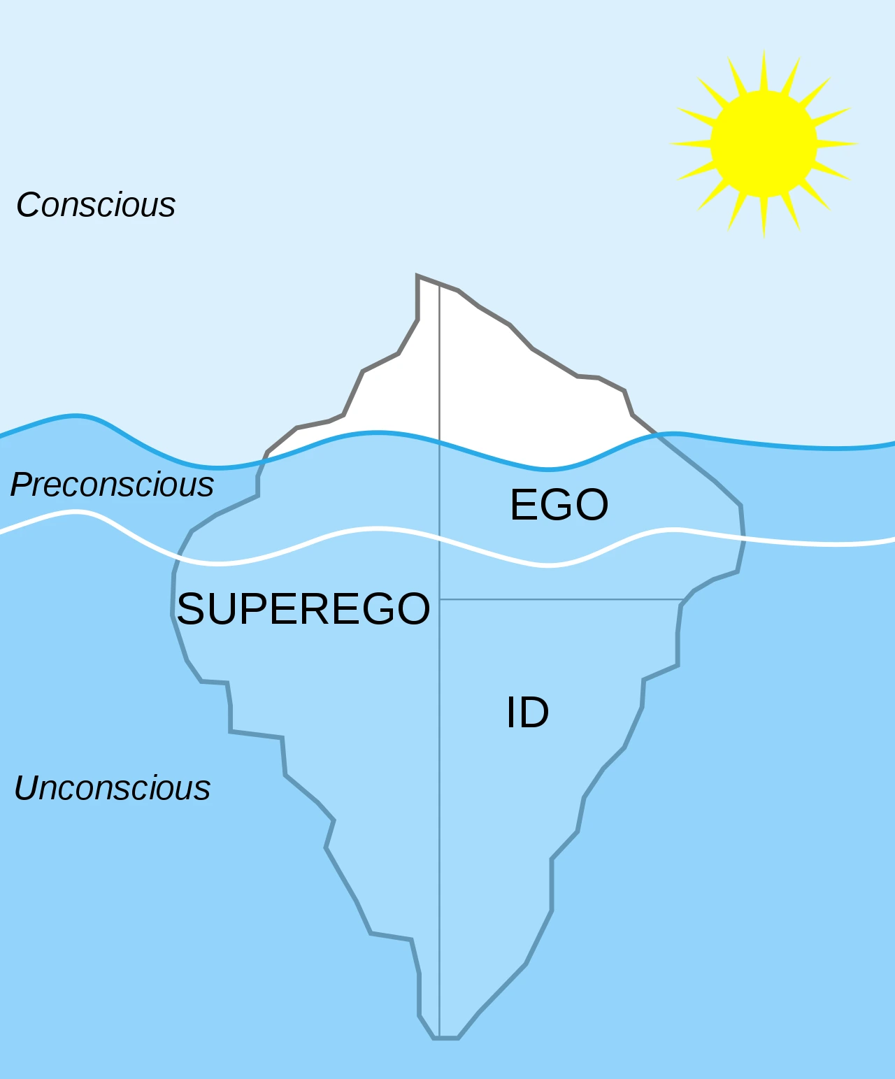 오스트리아의 의사 지그문트 프로이트는 인간의 마음의 심층 세계를 학문으로써 처음 설명하기 시작한 정신분석학의 아버지이자 심리학의 거두다. 정신분석학에 따르면 인간의 정신은 의식(깨어 있는 상태에서 자기 자신이나 사물에 대하여 인식하는 작용)-전의식(현재는 의식되지 아니하나 충분한 자극이 주어진다면 의식으로 소생될 수 있는 정신영역. 의식과 무의식의 경계를 뜻함) -무의식(일반적으로 각성·인지되지 않은 심적 상태)으로 나뉘어 기능한다. 이 세 가지 영역은 서로 끊임없는 상호작용을 통해 사고를 이루며, 따라서 사람의 모든 생각과 활동은 의식과 무의식 간의 갈등과 경쟁의 결과다. 그러나 정신에서 그 규모와 영역은 무의식이 의식에 비해 훨씬 방대하며, 인간의 심리는 대체로 이 무의식에 의해 좌우된다.