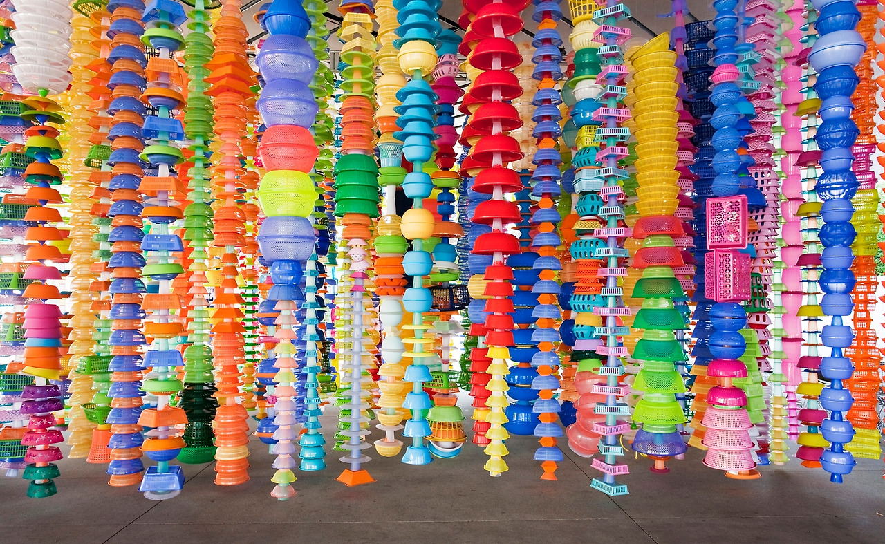 우리나라의 최정화 역시 키치적인 사물을 낯선 방법으로 배치하고 설치하는 방법으로 작업하는 작가다. 그를 대표하는 소재는 가장 한국적인 대량 생산물 중 하나인 플라스틱 소쿠리다. 색색깔의 원색 바구니를 탑처럼 반복하여 쌓고 나열하는 과정을 통해 진짜와 가짜, 작품과 상품, 예술과 일상의 경계를 흐릿하게 한다. 재래시장에서 볼법한 유리컵과 유리그릇들이 전시관에 나열되고, 싸구려 플라스틱이 주는 익숙함이 낯선 감각으로 바뀌는 과정을 직접 체험하다 보면 손택이 말한 캠프의 감수성을 잘 느낄 수 있다.