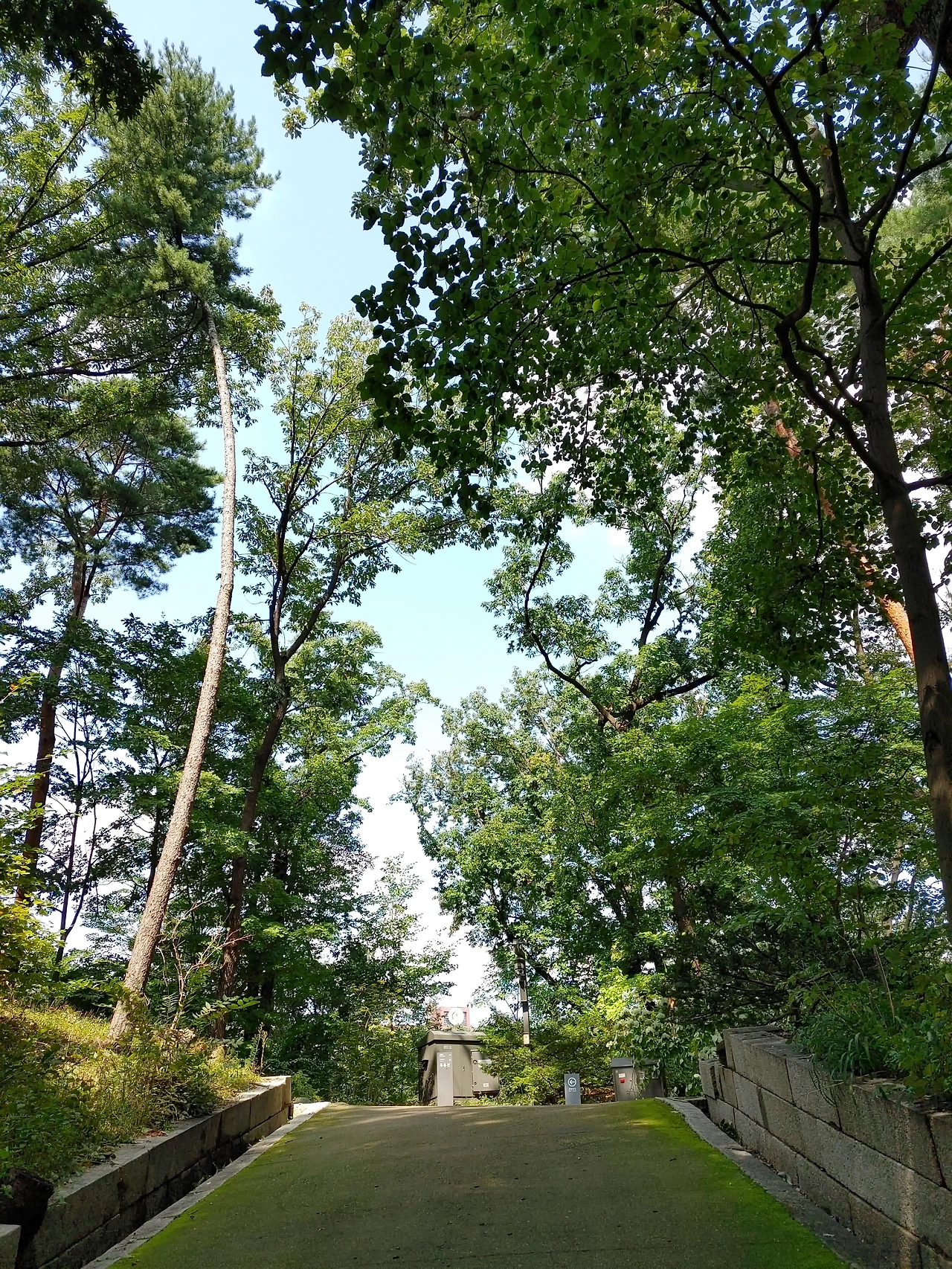 언덕 끝 도서관과 학생회관 앞 계단에서.