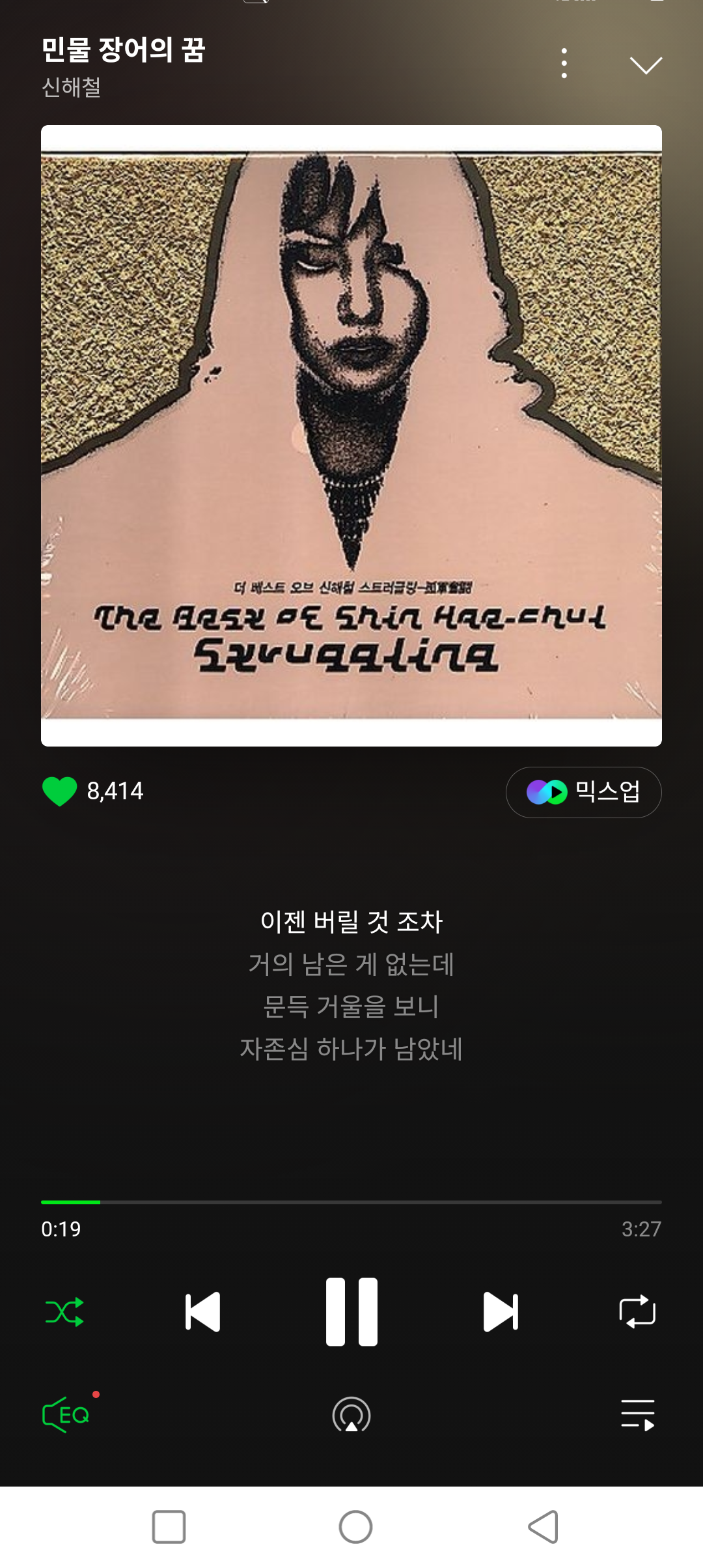 감정이 바닥으로 내려앉거나 인간적 존엄성 같은 게 타인이나 주변 환경으로 인해 심하게 훼손된 날이면 <민물장어의 꿈>을 듣고 자면 위로가 돼. 그 노래 가사 전체가 그대로 내 기분과 100 퍼센트 일치하는 기분이랄까. 그렇게 쓸려 보내면 또 다른 에너지로 삶을 채우게 돼. 정말 남은 게 자존심 하나밖엔 없는 것 같고, 나를 어떻게든 뾰족하게 깎고 잘라야 할 것 같고, 미련 없이 세상을 떠날 땐 내가 누군지 스스로 답할 수 있으면 좋겠다는 염원을 품고 다시 걸어보자, 이런 희망을 품게 되거든.