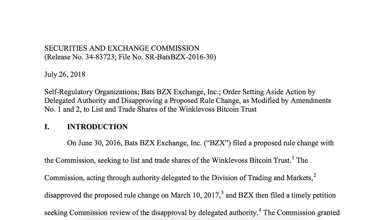 [5] Self-Regulatory Organizations; Bats BZX Exchange, Inc.; Order Setting Aside Action by Delegated Authority and Disapproving a Proposed Rule Change, as Modified by Amendments №1 and 2, to List and Trade Shares of the Winklevoss Bitcoin Trust. (2018, July 26). Retrieved from https://www.sec.gov/rules/other/2018/34-83723.pdf