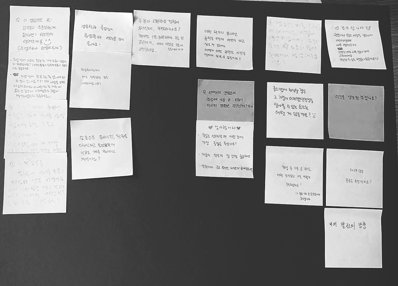 진행 방식은 나라는 사람, 그리고 대학생활 때 어떤 경험을 했는지 간략하게 먼저 설명을 해주고, 질문하기 쑥쓰러울 수 있기에 포스트잇에 궁금한 점을 모두 적어주면, 그 내용을 다시 정리해서 답변을 해주는 형식이었다.