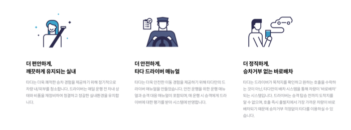 "오늘도 좋은 하루 보내세요~" 한마디로 마음이 따뜻해지는 말들이 있다. 개인적으로 나는, 그곳이 택시라면 더욱 감동을 받는다. 왜냐.. 여자(라는 한정을 두고 싶진 않지만) 혼자 택시를 타게 되면 어이없고 조금은 황당하고, 또 한편으로는 달리는 차만 아니면 내리고 싶다고 생각이 들게끔 하는 일들도 종종 있다. 물론 선량하고 따뜻한 마음씨를 가지신 택시 기사님들이 훨씬 더 많다는 것은 사실이지만, 그 누구쯤은 Worst 한 기억 서너 개쯤은 갖고 있으리라. 그렇게 타다(TADA)는 혜성처럼 등장했다.