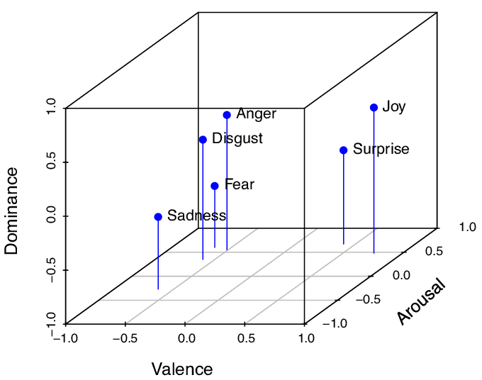 이처럼 인간의 감정은 기본 감정만으로 표현되기 어려운 복합적인 존재입니다. 그렇기 때문에 인간의 감정을 분절된 유목이 아닌 연속적인 공간 상에서 이해하려는 시도가 등장하게 됩니다. 아래 그림은 이러한 대표적인 시도를 보여주는데, 감정을 Valence - Arousal - Dominance 공간의 3차원 연속적인 공간 상에서 표현할 수 있다고 가정하고 기본 감정을 이 공간에 투영한 것입니다. Valence는 감정이 어느 정도로 유쾌한지 혹은 불쾌한지, Arousal은 감정으로 인해서 얼마나 신체적인 흥분 상태가 되었는지, Dominance는 감정으로 인해 얼마나 통제력을 잃는지를 나타냅니다. 예를 들면, 분노는 Valence 상에서 낮은 값을 갖고 (불쾌), Arousal 상에서 높은 값을 갖고 (흥분), Dominance 상에서 중간 값을 가집니다. (적당한 수준의 통제) 반면, 행복은 높은 Valence, 낮은 Arousal, 낮은 Dominance 값을 갖게 됩니다.