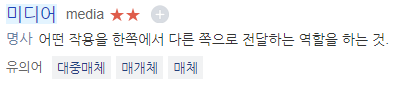 명사. media 한쪽에서 다른 쪽으로 전달하는 역할을 하는 것.