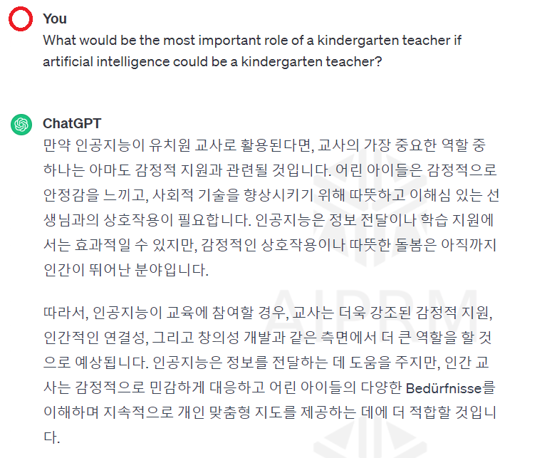 그래도 유치원교사를 인공지능이 하게 되면 중요한 역할이 뭐가 될지 물어봤다. 감정적 지원이 중요하다고 말한다. 그리고 유치원 교사는 개인 맞춤형 지도에 더욱 힘을 쏟을 수 있을 것이라고 말하고 있다.