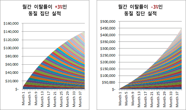 코호트가 3% 이탈 혹은 -3% 이탈을 할 때 행동하는 방식을 보여주는 아래 두 그래프를 통해 마이너스 이탈의 힘을 설명드리겠습니다.