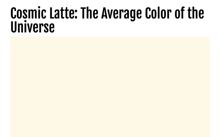 "우주는 어떤 색을 띄고 있을까? (좀 더 구체적으로 묻자면) 온 하늘의 빛이 뿌옇게 뭉게져서 하나가 되었다고 가정했을 때, 그 하늘은 무슨 색을 띌까? 우리 근처의 은하계에서 가장 흔한 별들은 과연 어떤 별일지를 알아보던 중 이 궁금증이 불쑥 생겨났다. 답은 바로 위에 나와있듯이, 베이지 쯤으로 보일만한 색이다. 디지털 색상 코드 : #FFF8E7. 천문학자들은 이 답을 내리기 위해 큰 표본의 은하 분석 자료(200,000개 은하를 다룬 2dF 조사) 중 은하들이 방출하는 빛의 평균을 계산했다. 결과로 확인한 우주의 스펙트럼은 전자기 스펙트럼의 모든 부분에서 걸쳐서 방출됐지만, 그 복합적인 빛은 우리에게 단 하나의 색으로 보여졌다.