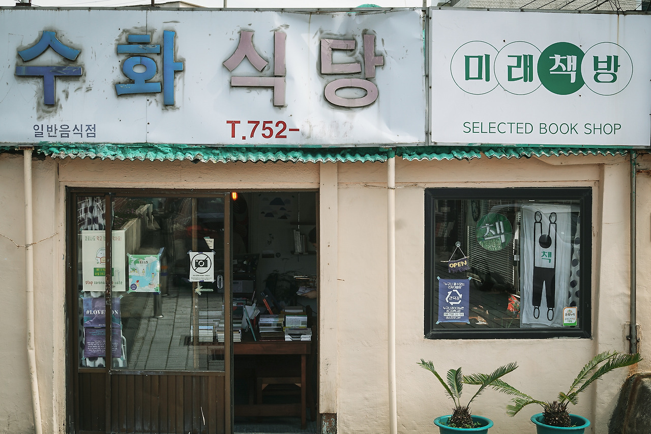 다행히 이 가게엔 진짜 이름(간판)이 옛 간판 옆에 나란히 붙어있다. 옛 식당을 재생하여 만들어진 책방이다. 이름은 미래책방. 아이러니하지. 과거의 공간에 미래의 이름이 달린 백투더퓨처같은 매력.