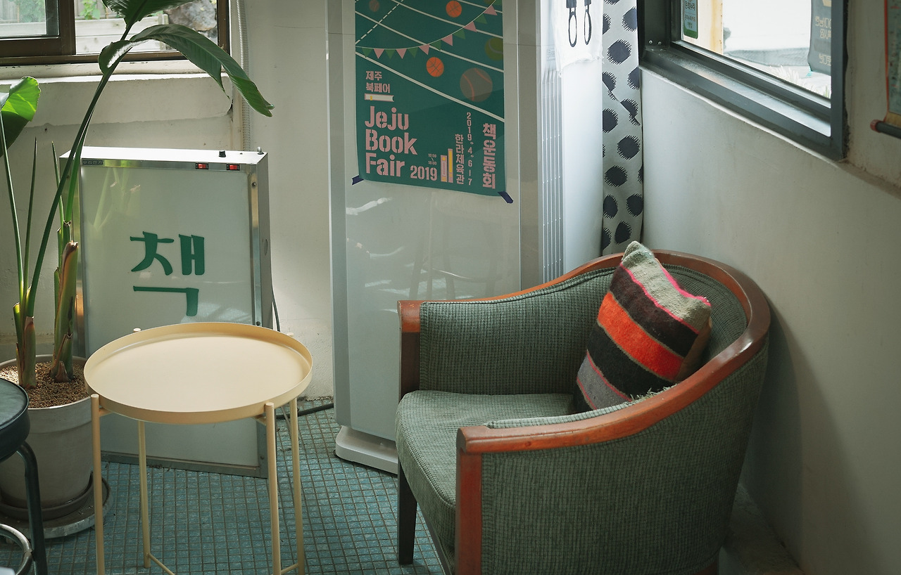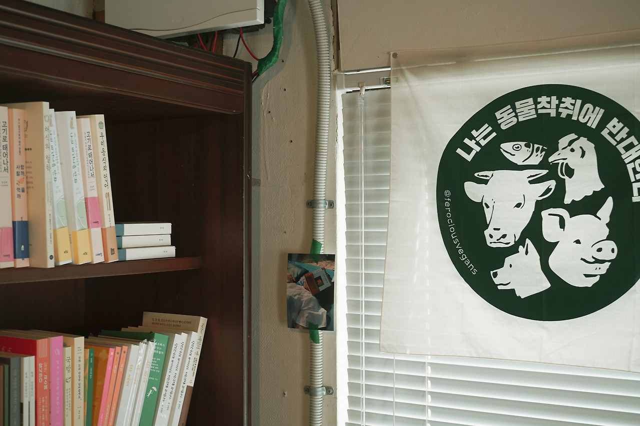 인테리어를 전공한 사장님이 직접 뜯어고쳐 만들어진 책방 공간에는 그녀의 취향이 잔뜩 묻어있다. 책의 큐레이션으로 보건대 페미니즘, 채식, 제주에 깊은 관심사가 있으리라. “나는 동물 착취에 반대한다”라는 문구가 걸린 왼편으로 동물복지에 관한 책들이 진열되어 있다. 책방이라는 공간을 통해 자신의 신념을 표현하고 있으니 단순히 가게를 운영하는 것을 넘어서 ‘예술’을 하는 것과 다르지 않아 보인다.