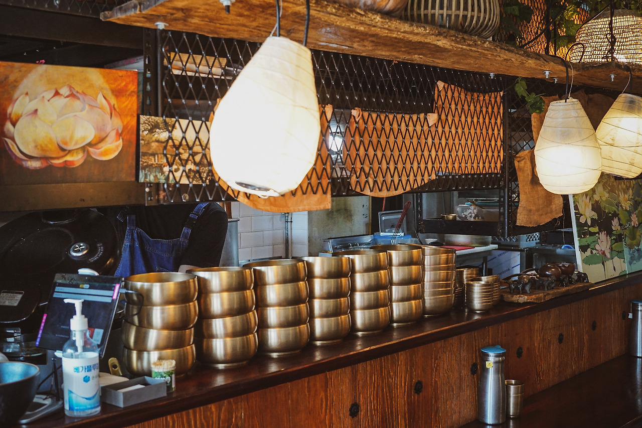 가게 간판에 쓰인 글귀다. 오롯에서는 전복게우, 꼬막, 청어알, 멍게젓 등 값비싼 재료들이 아낌없이 들어간 비빔밥을 맛볼 수 있다. 밑반찬, 국, 제육볶음과 쌈이 무거운 놋그릇에 담겨 정갈하게 차려진다. 제육볶음이 기본 찬으로 나오기엔 너무 고급진 맛이다. 이럴 수가, 무한 리필해주신단다.