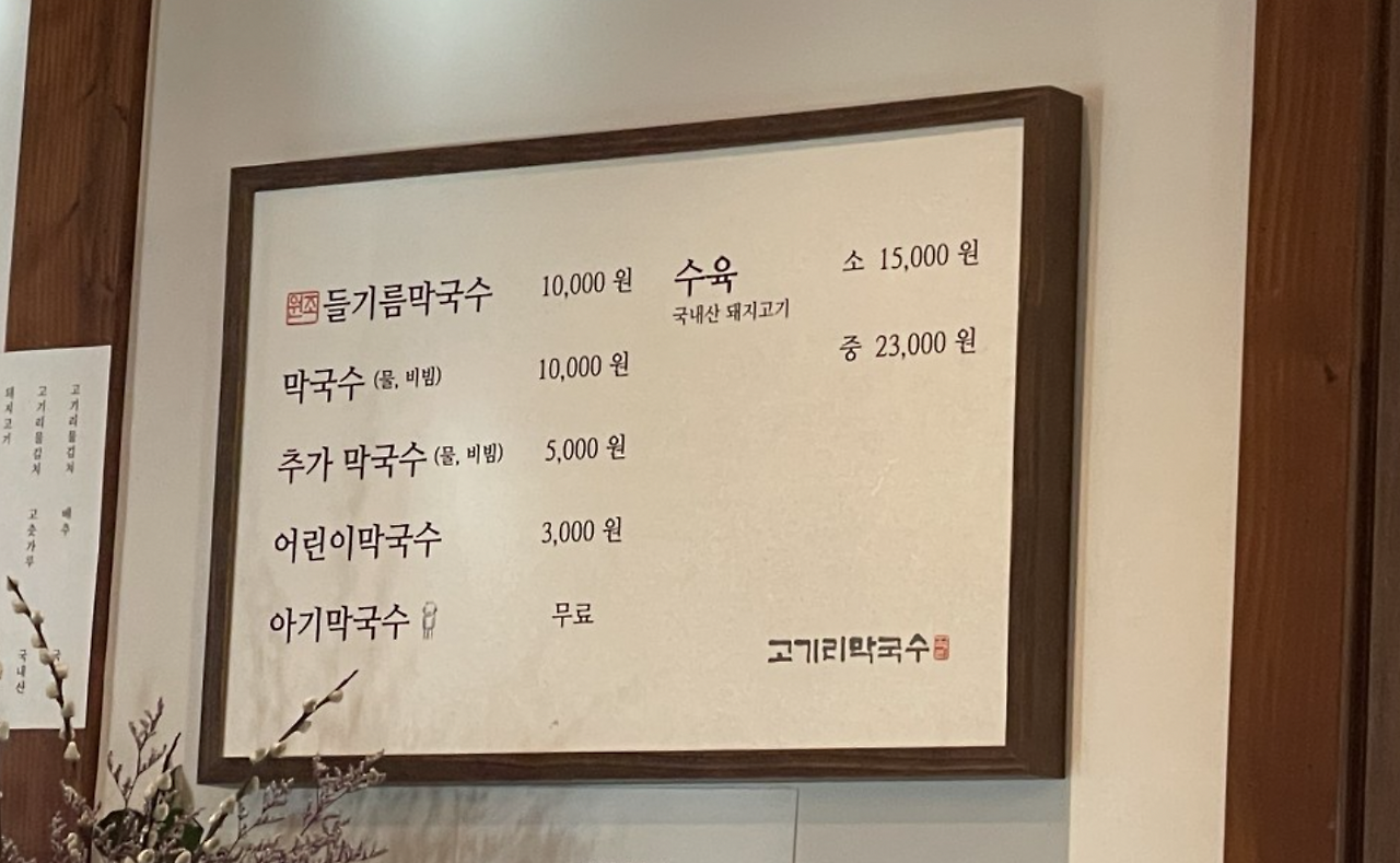 어렵게 입성했으니 메뉴 하나만 먹긴 아쉬워 들기름 막국수와 수육 소 자를 함께 주문했습니다. 그러자 직원 분께서 1인을 위한 수육 한 접시 메뉴가 있는데 괜찮다면 그걸 주문해 보는 것이 어떻겠냐고 정중하게 제안합니다. 오, 감사히 그러겠다고 했습니다.