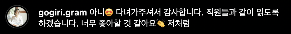 식사를 한 날에 개인 인스타그램에 후기를 올렸더니 <고기리 막국수> 대표님께서 아래와 같이 댓글을 남겨 주셨습니다. 외부의 평판을 직원들에게 있는 그대로 공유하는 일은 비용을 하나도 들이지 않고도 회사에 대한 소속감을 높일 수 있습니다. 그 결과, 홀의 직원은 고객을 더욱 친절하게 대할 것이고 주방의 직원은 주방 청결에 더욱 힘쓸 것이 분명합니다.