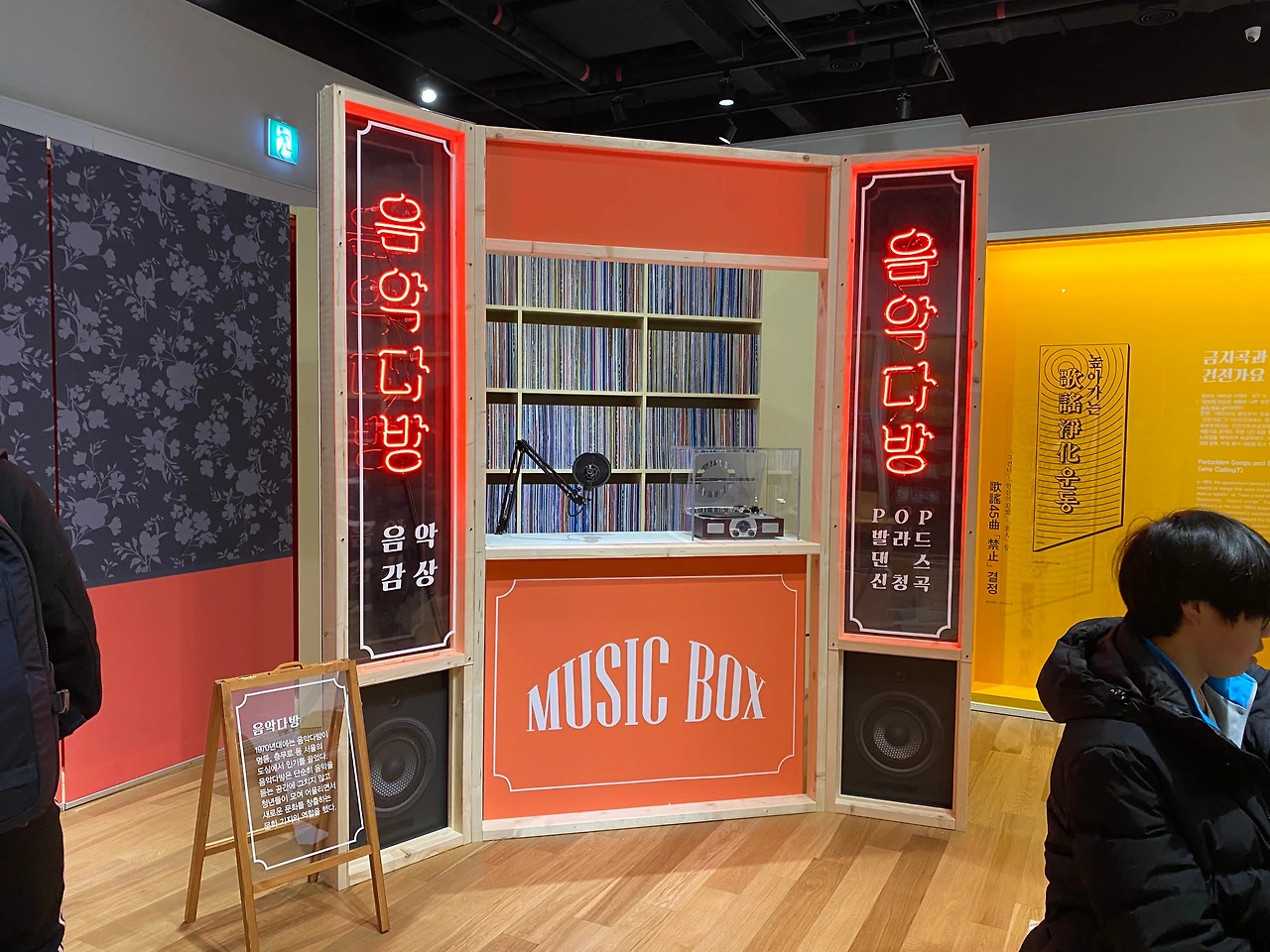 관람하기 위해 서둘러 발걸음을 옮긴 기획전시실. 강렬한 레드를 주조색으로 우리나라 대중음악의 계보에 대한 내용을 다루고 있었다. 레트로한 느낌이 확 나는 폰트를 사용해 공간을 구성했고 '음악 다방'등의 컨셉을 차용해 관람객이 당시 분위기를 따라갈 수 있도록 하는 다양한 장치가 있었다.