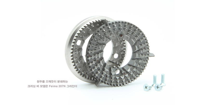 내구성을 높이거나 칼날이 쉽게 무뎌지는 것을 방지하기 위해 티타늄으로 코팅하기도 하고 칼날의 사이즈도 에스프레소용에 비해 큰 사이즈를 사용하기도 합니다.