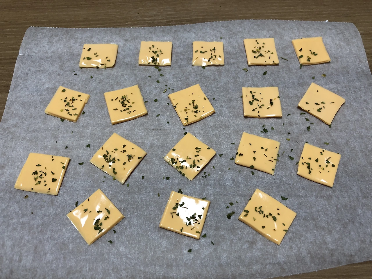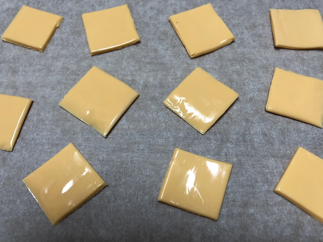 1. 체다 슬라이스 치즈를 먹기 좋은 크기로 잘라 종이 호일 위에 올린다.