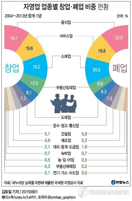 지난 10년간 우리나라에서는 매년 평균 100만 개에 가까운 자영업자가 생기고 80만 개가 문을 닫습니다. 국세청이 제출한 자료에 따르면 2004년~2013년 개인사업자(자영업) 창업은 949만 개, 폐업은 793만 개로 집계됐습니다.