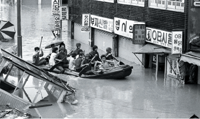 홍수가 한차례 지나가면 또 다른 재해가 항상 있었는데 그 뒤에 따라서 오던 태풍이 또 문제였다. 그 때문에 우리 동네같이 허술한 집들의 슬레이트 지붕들은 제자리에 가만히 있지 못하고 제비처럼 하늘 위로 날아다니기 일쑤였고 괜히 집 밖을 돌아다니다가 하늘을 떠돌다 떨어지는 슬레이트 지붕에 맞아 다치는 일도 있었다. 그때만큼은 제비 대신에 슬레이트 지붕이 하늘을 날아다니는 모습을 실컷 볼 수가 있었다. 지금 생각하면 너무 어이없는 상황에 웃음이 날 지경이지만 그 당시에 어른들은 정말 매년 겪으며 개선되지 않는 이 상황이 지긋지긋했었을 것이다.