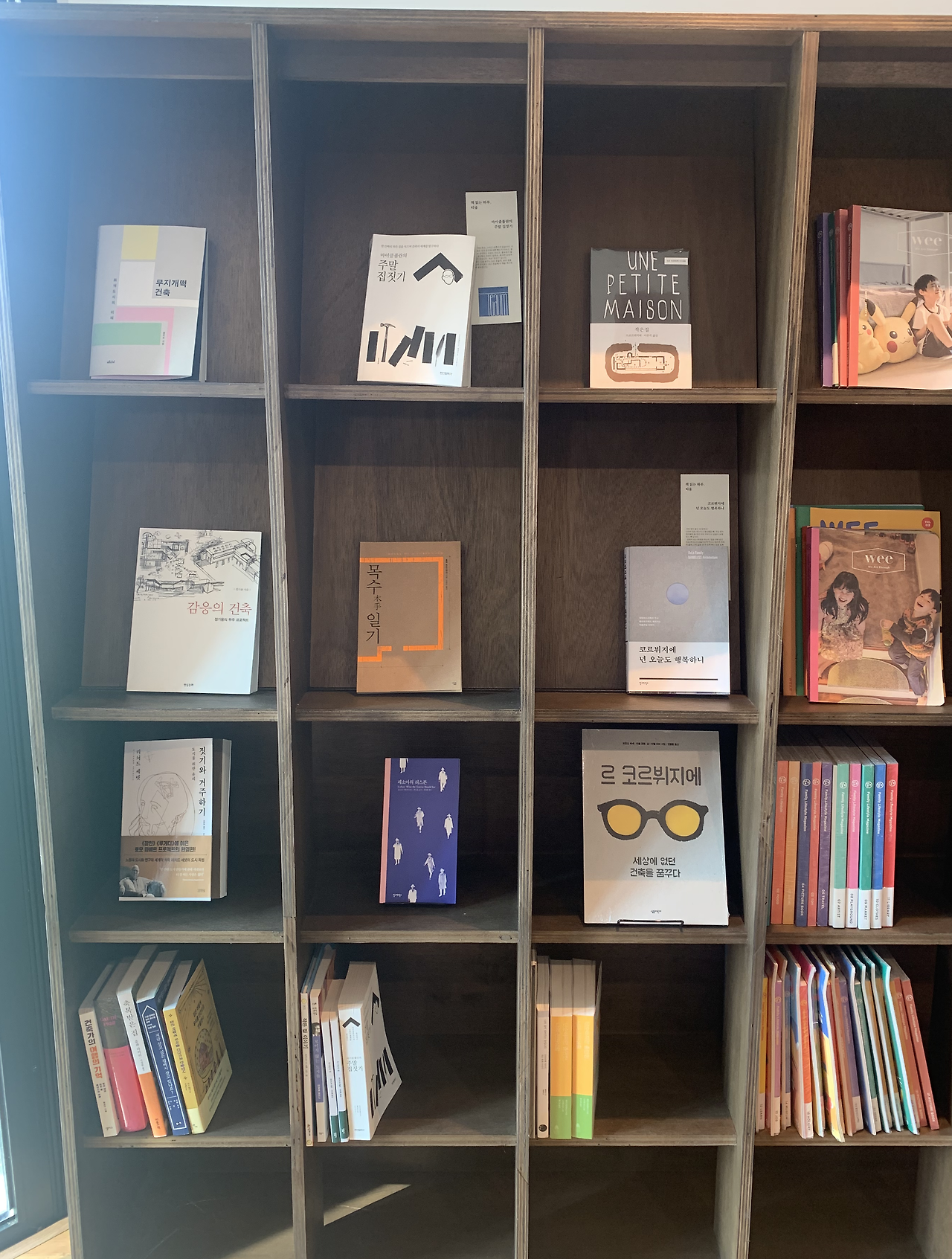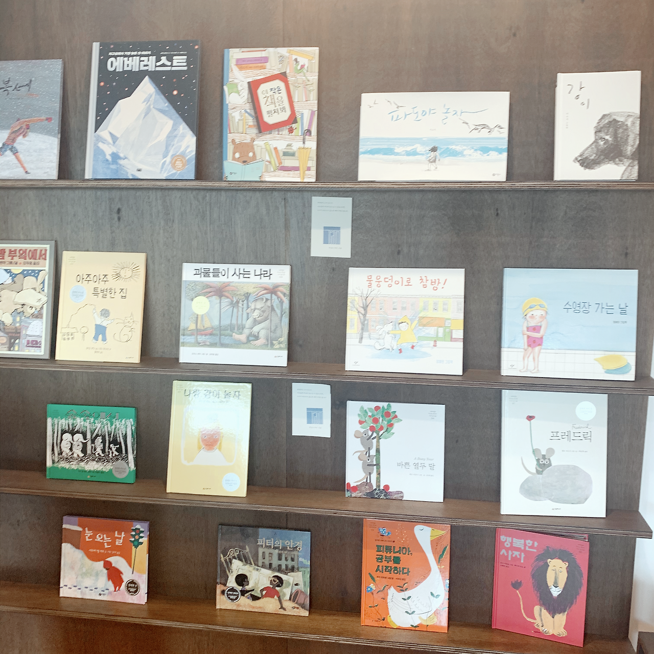 서점에서 가장 넓은 비중을 차지하는 어린이 공간. 책방 지기님이 아이를 키우고 계셔서 그런지 그림책 배치에 신경을 많이 쓰신 것 같다. 방문한 아이들이 아무렇게나 둘러앉아 동화책을 보고 깔깔대고 웃고 있었다. 티움에서는 아이들이 책을 보며 웃어도 장난을 쳐도 눈치보지 않는다. 엄마 아빠와 같이 와서 자유롭게 책을 읽을 수 있는 분위기여서 좋았다. 함께 간 우리 아이들도 어렸을 때 읽었던 책들을 발견하고 정겨운 친구를 오랜만에 만난 것처럼 반가워하며 읽었다.