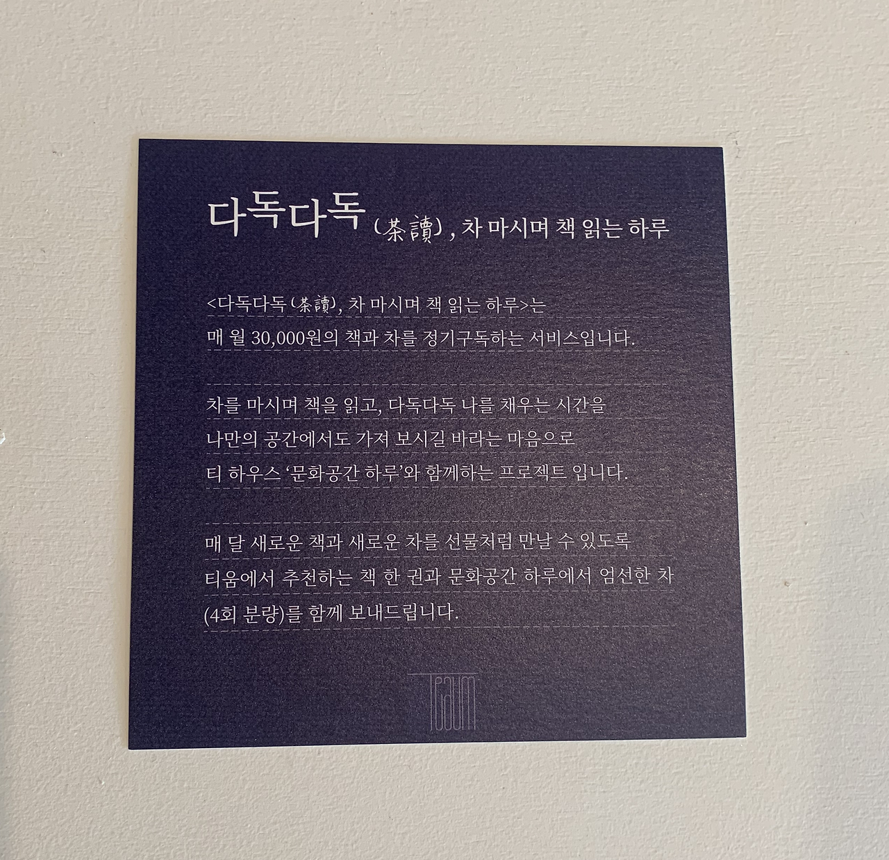 책방지기 - 티움은 ‘차를 마시며 책을 읽는 하루’를 모티브로 문을 열었어요. 그래서 차와 함께 하는 프로그램을 운영하고 있어요. 지난 5월에 하루에서 재배하는 찻잎을 수확해서 차로 만들어보는 프로젝트를 진행하고 9월부터는 ‘다독다독’ 구독 서비스 프로젝트를 운영 중이에요. 그리고 차와 책에 대한 이야기가 쌓이면, 책으로 엮어볼 계획도 갖고 있어요.