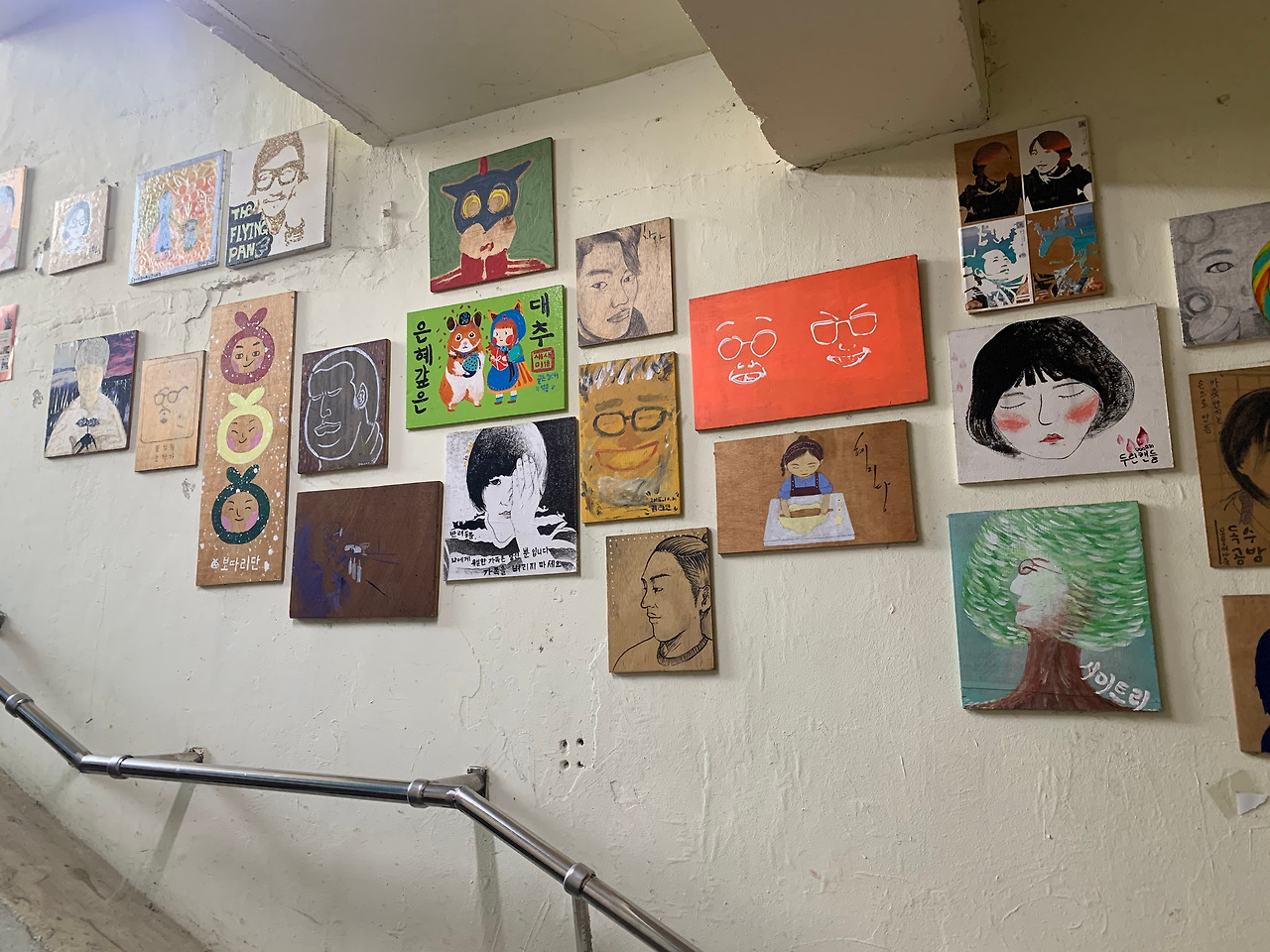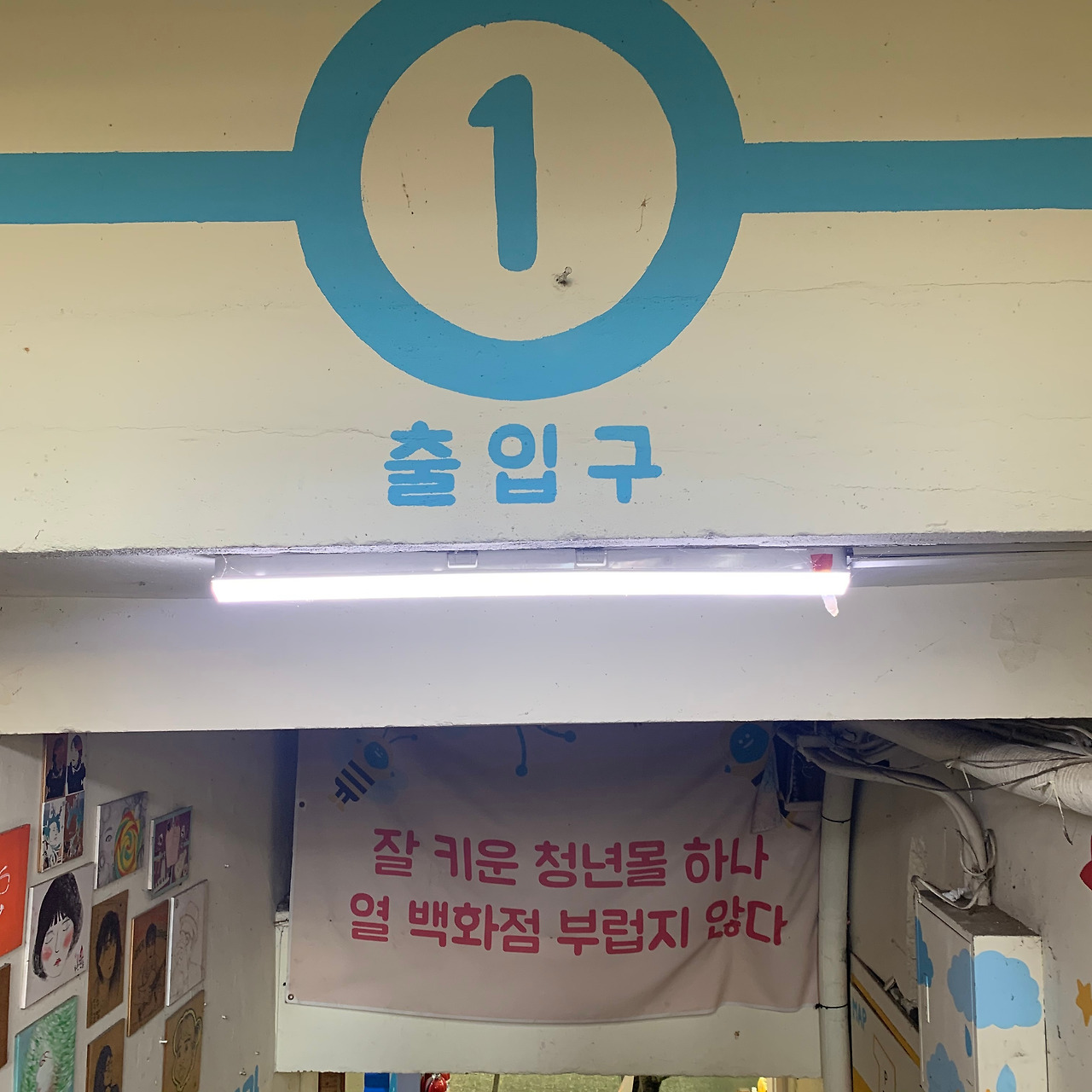 남부시장 1층을 여유롭게 구경하고 2층 청년몰로 향한다. 파란색 알림 표시가 상큼하고 발랄하다. 화살표를 따라 이동하면 출입구가 나오는데 계단 옆으로 걸린 그림들이 독특하고 개성 있다. "잘 키운 청년몰 하나 열 백화점 부럽지 않다." 패기 넘치고 센스 있는 문구에 저절로 웃음이 난다. 열 백화점 부럽지 않게 청년몰이 승승장구했으면 좋겠다.