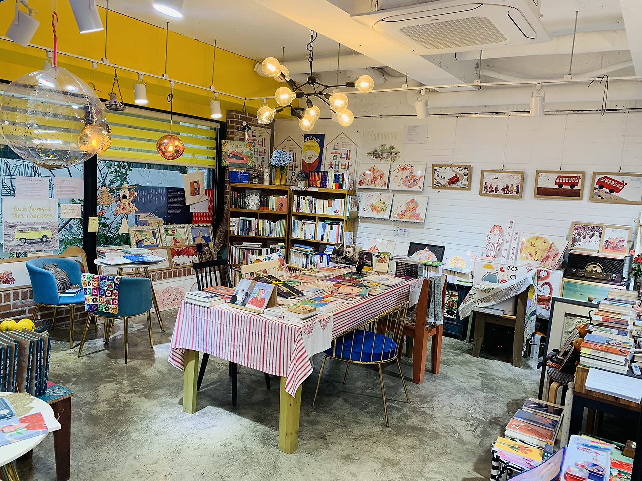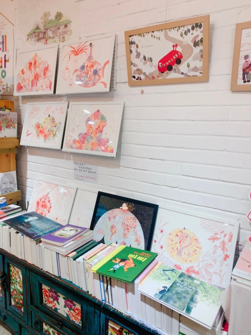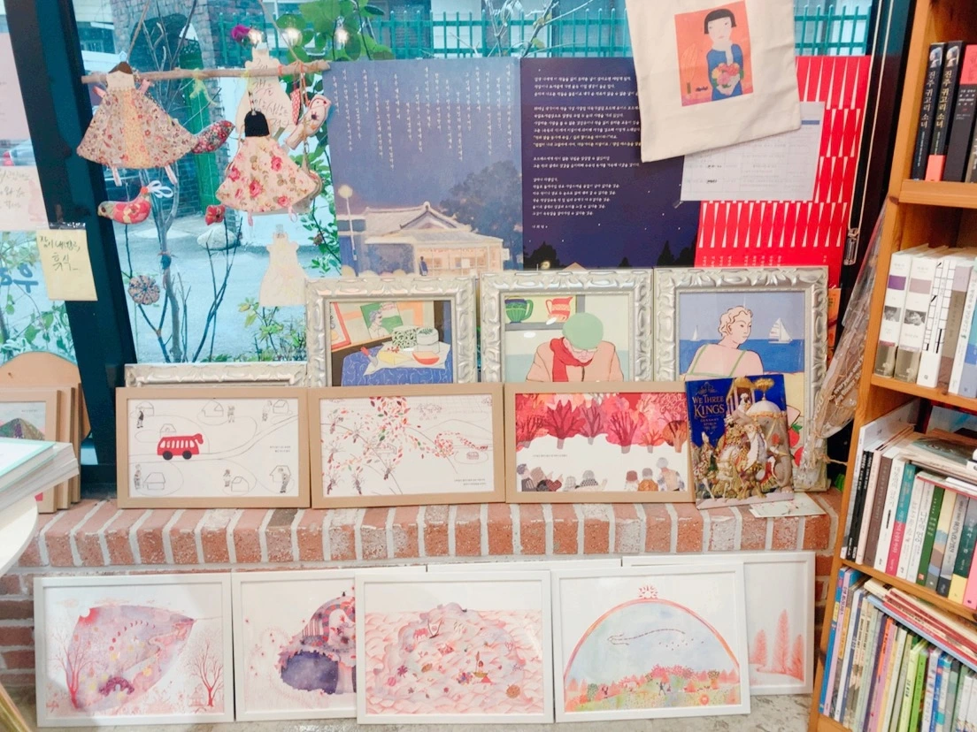 책방의 모든 면이 마치 갤러리 같다. 지기님이 직접 그린 그림들로 액자를 만들어 전시도 하고 그림책 속의 그림을 그려 함께 큐레이션 했다. 그림책을 소설책과 연관 짓고 그림책을 에세이와 연관 짓는다. 지기님을 그림책과 어울리는 소설책을 소개하고 그림책과 비슷한 내용의 에세이를 소개해 준다. 지기님은 책방의 모든 책을 속속들이 다 알고 누구에게 어떤 책을 소개해 줘야 할지를 알고 있는 듯했다. 많은 작가님을 초청해 강연회도 하고 사인회도 하고 함께 만들기도 하고 영상도 보며 마을에 활기를 불어넣는다. 아기자기 사랑스러운 굿즈들도 있다.