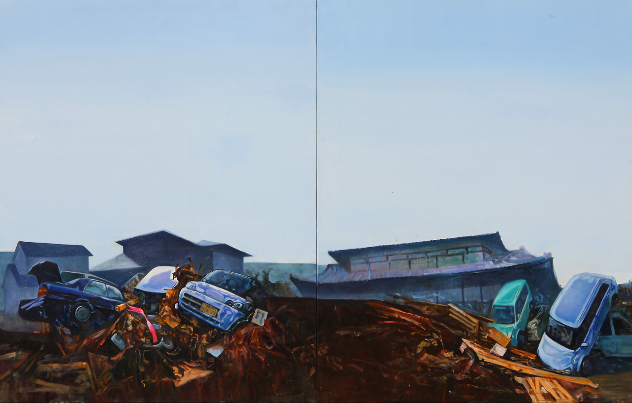 작품의 이미지로 차용된 것은 그 당시 끊임없이 보도되었던 일본의 쓰나미 사건 현장 이미지이다, 이 그림을 그릴 당시 '왜 겪어보지 않은 일들이 작가에게 의미가 있는가?'라는 질문을 받았다. 그래서 어린 시절 직접 재난을 경험한 일이 있는데 이 매스미디어 이미지를 통해 그 불안한 감정이 다시 증폭되는 느낌을 받고 그것이 굉장히 불편하다.'라는 대답을 했다. 초등학생 시절, 꽤 오래된 동네에서 살았던 경험이 있다. 잦은 누전으로 화재를 목격하는 일이 비일비재했고 심지어 우리 집 역시 화재를 당한 기억이 있는데, 일층 전체가 건물 안 형체를 알아볼 수 없을 정도로 까맣게 탔었다. 아주 오래된 기억임에도 불구하고 기억이 생생하다. 당시 초등학교 3학년이었던 나는 유치원에서 받은 소방교육 덕분에 수건을 물에 적셔 입과 코를 막고 단 둘이 있었던 세 살배기 동생과 함께 탈출한 기억이 있다. 그리고 7살 무렵, 버스에 치여서 교통사고에 당한일도 있었다. 다행이 몸살로 끝날 정도의 타박상이었지만 말이다. 그당시 주위 어른들은 재빠르고 의연하게 이런 사건들을 받아들이고 해결하는 듯이 보였던 나를 칭찬해주셨고, 스스로도 나는 괜찮다고 생각했다. 그러나 성인이 되어 특정 이미지 보도 자료로 인해 불편해지는 나를 발견했을때, 이 현상의 정당성에 대해 스스로 설득하기도 어려웠고 다른 사람들을 설득하기에도 어려움을 겪었다.