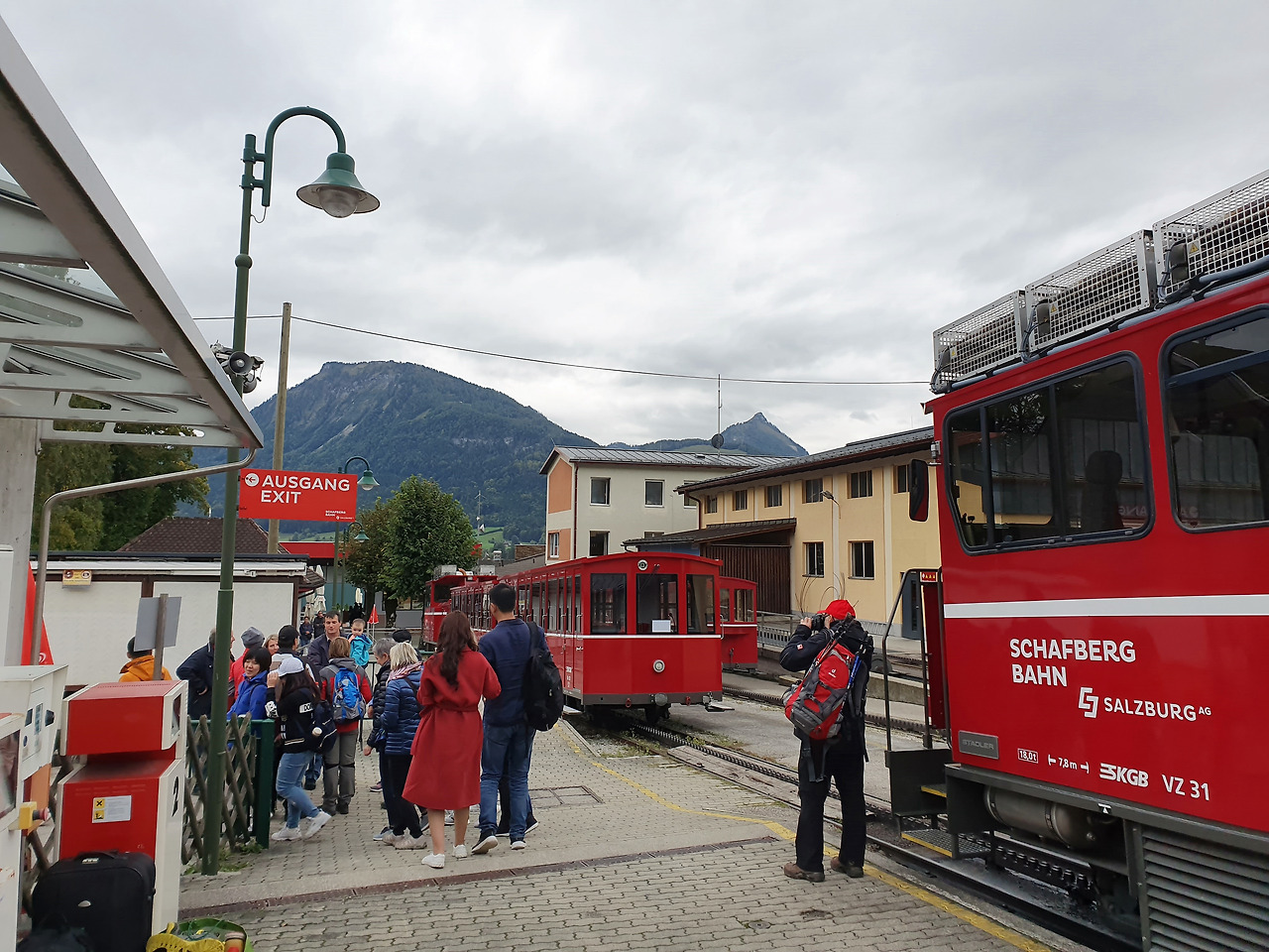 시간이 지날수록 바람이 더 세차게 불어서 급히 샤프베르크스피츠 호텔 식당으로 대피했다. 식당 입구에는 현지 맥주인 스티글을 광고하는 간판과 산악열차 탑승 시간을 알리는 화면이 있었다. 한적했던 바깥과 달리 식당 내부는 손님으로 가득 차 있었다. 자리가 없어서 10분 정도 기다리다가 직원의 안내를 받고 착석했다. 스티글 맥주를 시킨 후 주변을 둘러보니 한 소년이 전통 의상을 입고 서빙을 하고 있었다. 멜빵바지 차림으로 열심히 주문을 받고 음식을 나르는 모습이 귀여우면서도 기특했다. 맥주를 마시면서 밀린 일기를 쓰다가 오후 4시쯤 밖으로 나섰다.