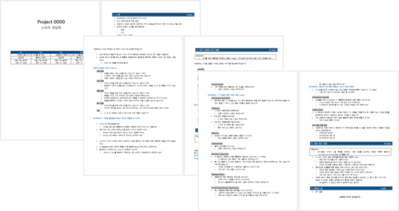 가이드라인은 단순히 문서를 작성하는 것 이상의 의미를 가진다. 해당 조사에서 무엇을 알고 싶은지, 그리고 그것을 어떻게 사용자로부터 끌어낼 수 있을지를 정확하게 파악하고 있을 때 비로소 올바른 가이드라인이 나올 수 있기 때문이다. 개인적으로 나는 90%의 시간을 어떻게 흐름을 짤지, 어떤 질문을 던질지를 머릿속으로 구상하는데 소비하며, 실제로 그것을 문서로 옮겨 적는 작업은 10~15분 정도 소비하는 편이다.