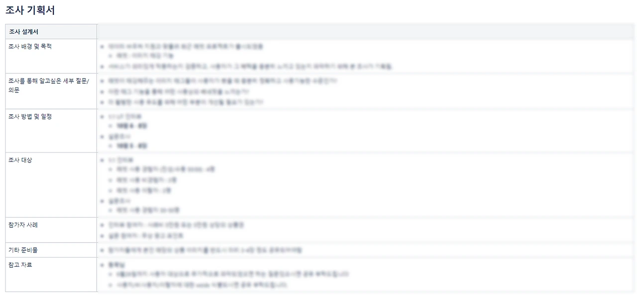 여기서 가장 중요한 점은 명확한 조사의 목적과, 그 목적 달성을 위해 파악되어야 하는 질문을 식별하는 것이다. 이 두 질문에 대한 정확한 식별과 합의를 도출하기 위해 PM과의 협업이 매우 중요한데, 해당 기능의 히스토리와 가능한 수정 방향성에 대해서 가장 잘 이해하고 있는 직책이 PM 이기 때문이다. 따라서 PM과의 협업을 통해 리서처는 해당 기능에 대해서 더 깊이 있는 배경 지식과 작동 원리를 파악하고, 조사가 어떤 방향으로 설계되었으면 하는지에 대한 PM의 의견을 경청하고 최대한 반영한다.