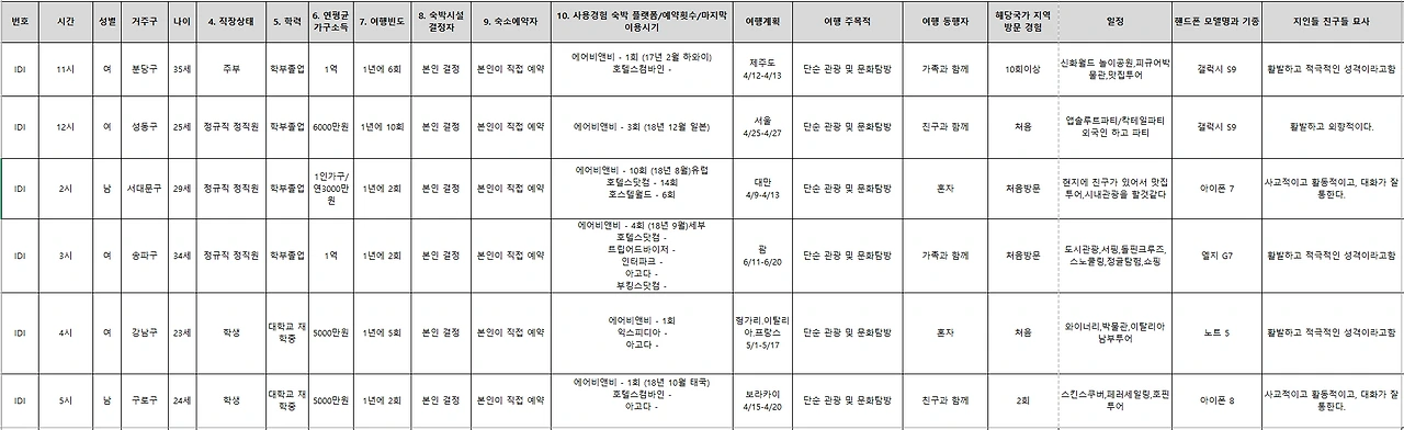 가상으로 몇 가지 핵심적인 조건만 잡아봤으나, 실제로는 더 많을 수도, 더 적을 수도 있다. 중요한 사실은 제대로 된 사용자 조사를 위해서는 단순히 여행을 좋아하고 조사를 참여할 마음이 있는 사람이라고 아무나 섭외될 수 없다는 점이다. 유럽 여행을 다녀왔지만 1년 전, 2년 전에 다녀왔다면 너무 오래전 일이라 기억이 가물가물 할 수 있다. 다녀왔던 유럽 여행이 패키지여행이거나, 친구나 가족이 여행 계획을 좀 더 주도적으로 수립하는 여행이었다면, 내가 직접 여행 계획을 짤 필요가 없을 테니 이번 조사에서 알아보고 싶은 주제에 대한 의견이 없을 수도 있다. 단독 여행 vs 단체 여행에 따른 Quota (할당 인원)이 정해져 있으므로, 만약 단독 여행 3명이 이미 모집이 완료되었는데 추가로 섭외된 사람이 단독 여행 경험자라면 섭외할 수가 없다.