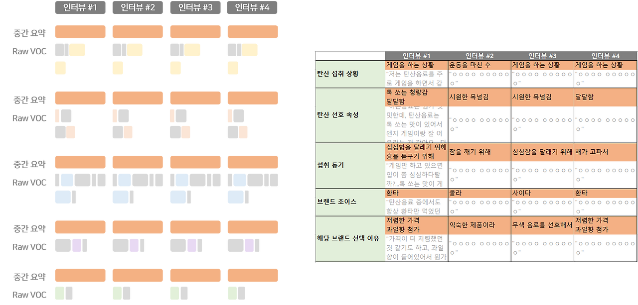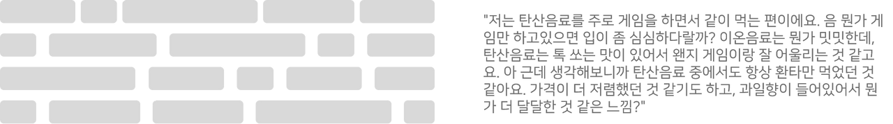 "이온음료는 뭔가 밋밋한데, 탄산음료는 톡 쏘는 맛이 있어서 왠지 게임이랑 잘 어울리는 것 같아요... 더 달달한 느낌? - 탄산음료 선호 속성