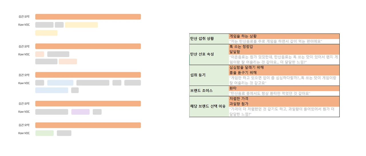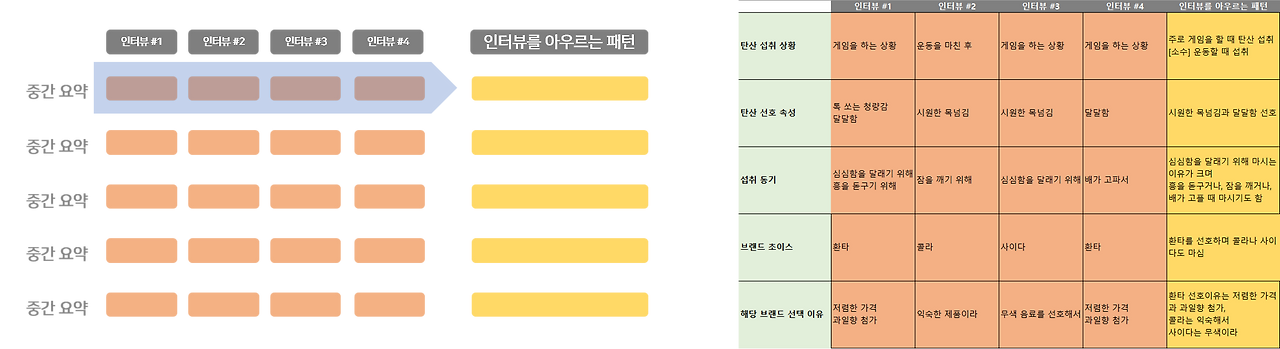 중간 요약을 했던 가장 큰 이유는 정보를 단순화하여, 정보처리 과정의 효율성을 향상하기 위함이다. 이제 우리는 깔끔하게 요약된 (즉, 본래의 정보가 누락되지 않은) 문장들을 횡으로 비교해 가며 패턴을 찾으면 된다. 음료수를 마시는 상황에 요약된 내용을 가로로 살펴보면, 몇명의 사용자들이 겹치는 응답을 하였는지 쉽게 볼수 있다.
