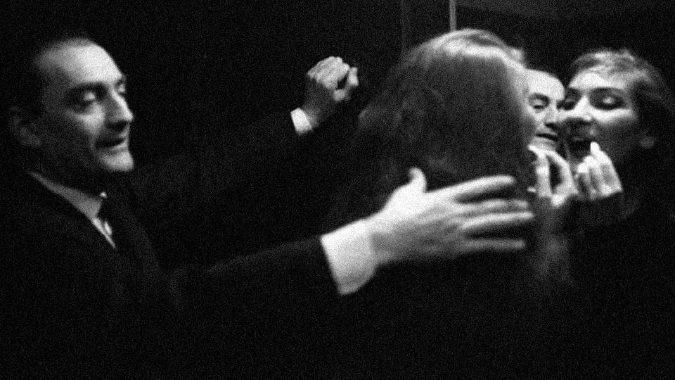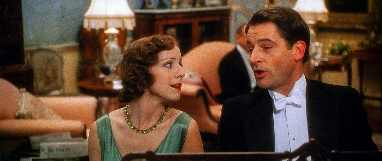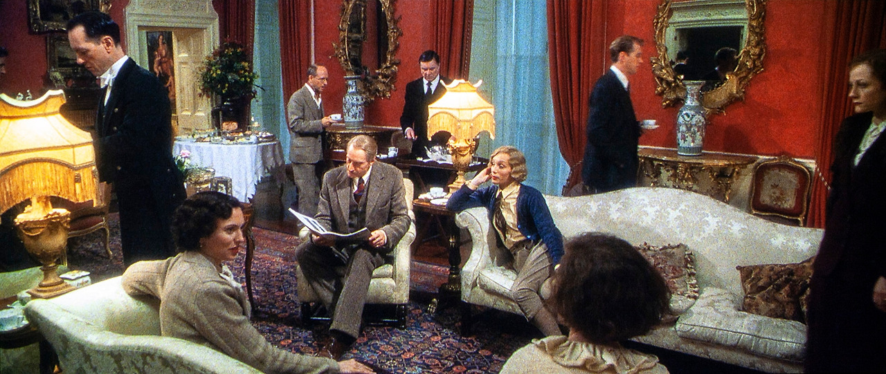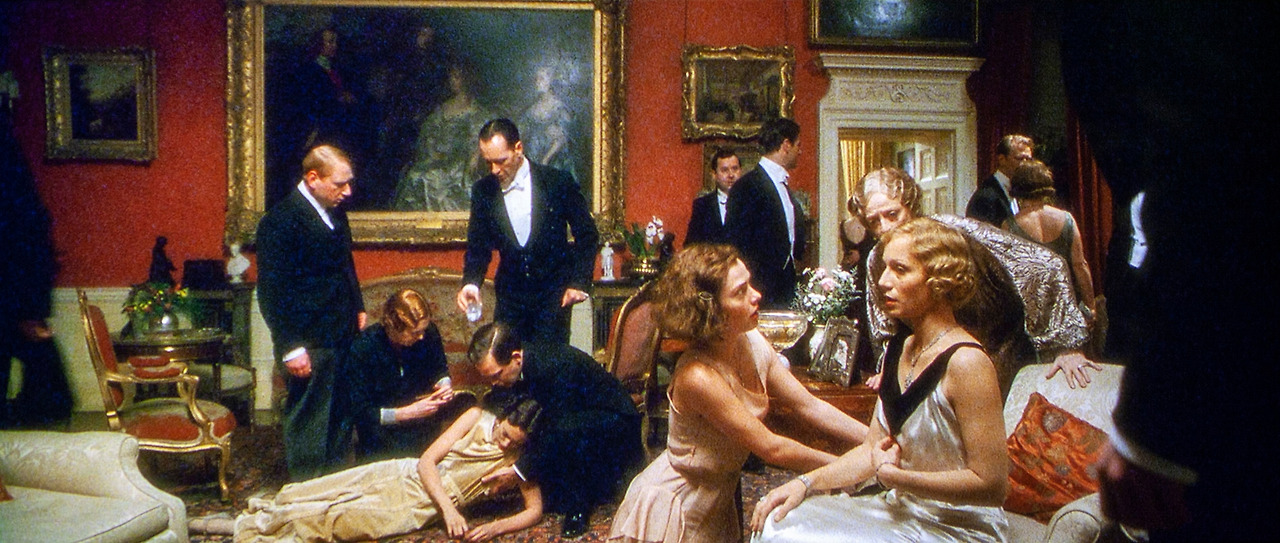 영화에서 중요한 분량을 차지하는 귀족들의 식사 이후, 응접실에서 진행되는 애프터 파티는 한 화면 내에서 여러 가지 서사가 동시에 진행되는 좋은 예로, 실비아 부인의 부탁으로 피아노 연주를 시작한 아이버 노벨로, 문 밖에서 숨어 노래를 듣는 시종들, 멀리서 브리지 카드 게임을 하며 타인을 욕하는 트렌섬 부인, 귀족들 사이에서 따돌림을 당하고 있는 평민 출신의 메이블 네스빗 부인, 미국의 제작사와 국제 통화를 하면서 저택의 상황을 설명하는 모리스 와이스먼의 이야기가 동시다발로 진행된다. 카메라는 여러 인물들 사이를 숨 가쁘게 움직이지만, 클로즈업은 거의 없다. 때문에 다양한 인물들이 비치지만, 대부분의 씬에서는 여러 명 이상의 인물이 동시에 각자의 서사를 풀어나간다. 눈을 깜빡하면 중요한 부분을 놓칠 수도 있는 이 연출은 올트먼 감독의 의도된 결과물이다.