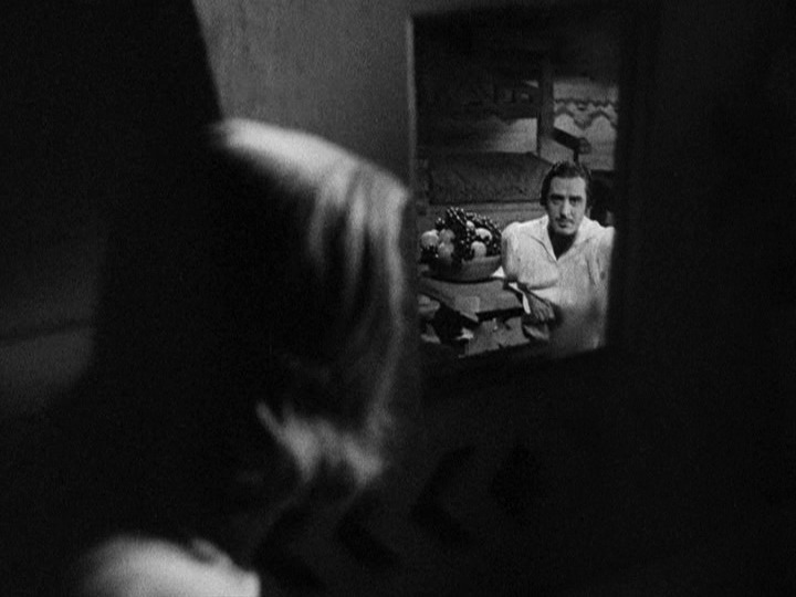 바닥에 자유롭게 누워 안토니오가 건네주는 포도를 음미하던 크리스티나는 문득 일어나서 지난 며칠간 묵어왔던 방을 긴장이 서린 표정으로, 마치 잊었던 무언가를 찾는 듯이 둘러본다. 방 전체를 담는 와이드로 전환한 숏은 그녀가 일어나서 천천히 방을 배회하는 모습을 담는다. 크리스티나의 걷는 속도로 미루어 보아, 그녀가 무언가를 찾고 있던 지간에 딱히 급한 상황은 아닌 듯하다. 카메라는 패닝 해 벽의 작은 장롱으로 다가가는 크리스티나를 보여주고, 크리스티나는 천천히 찬장을, 그리고 찬장 위에 놓여있는 촛불을 쓰다듬는다. 찬장의 옆으로 돌아간 그녀를 담기 위해 카메라는 위치를 옮겨 거울을 들여다보는 숏으로 전환된다. 관객은 크리스티나의 얼굴, 그리고 거울에 비친 크리스티나의 얼굴을 보고 있지만, 다음 인서트에서 관객은 크리스티나가 거울에 비친 안토니오를 바라보고 있음을 깨닫는다.