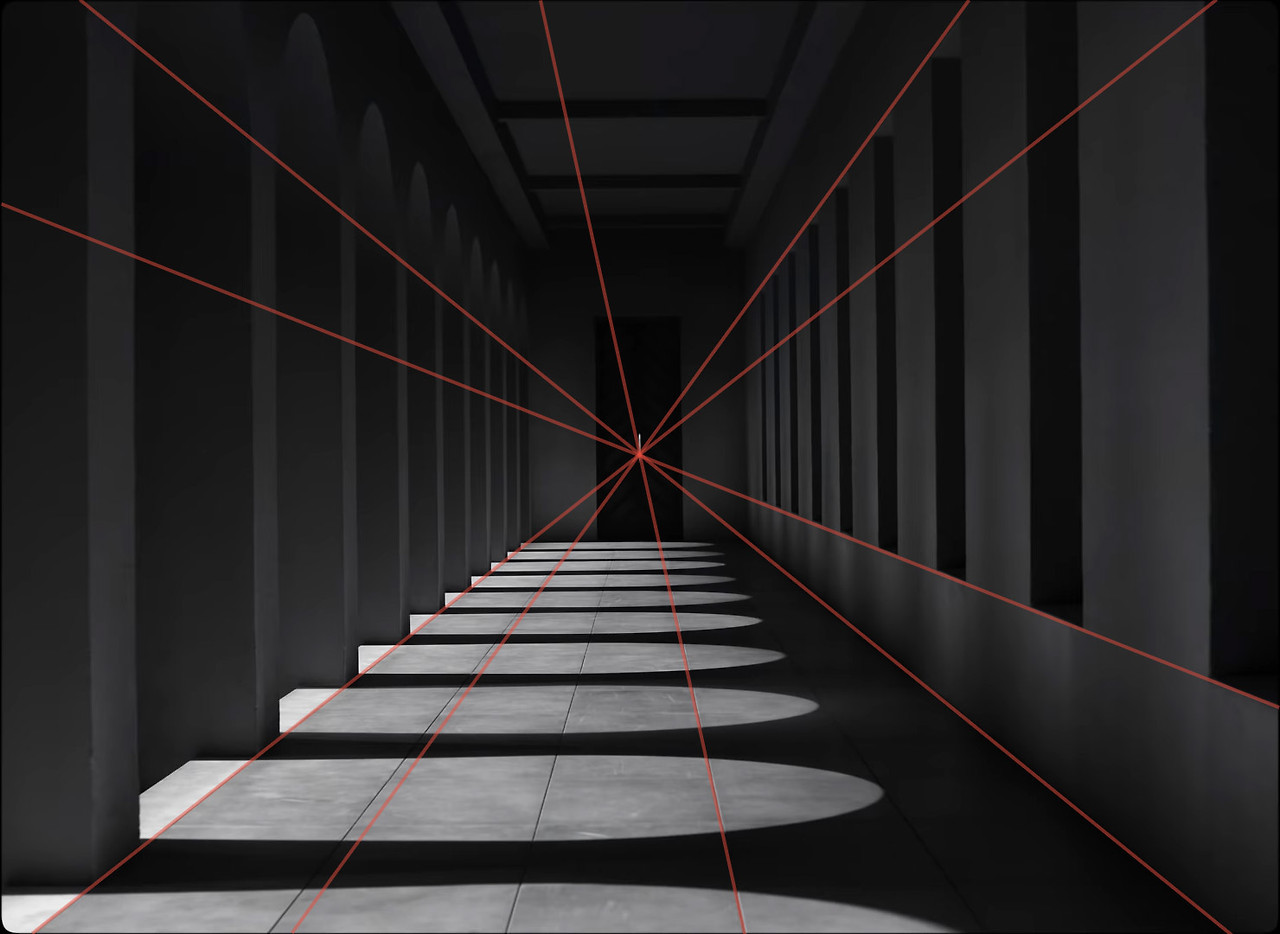 〈맥베스의 비극〉을 보다 보면, 특유의 기하학 세트로 인하여 선과 면으로 환원된 건축물들의 디자인 때문에 소실점이 도드라지게 드러나는 숏들이 있다. 그중에서도 소실점이 화면의 정중앙에 위치해, 1명의 인물을 소실점에 배치하거나, 또는 카메라가 정면을 향해 달리인(dolly in)하는 형태로, 공간의 모든 요소가 정중앙에 위치한 인물, 또는 오브제를 향하는 원포인트(One-Point Perspective) 숏 구성이 무척 인상적이다. 예시로 던컨 왕이 잠들어있는 객실로 다가가는 맥베스의 시점에서 바라보는 문의 중앙에 위치한 손잡이는 조명 때문에 마치 단검처럼 보이면서, 맥베스의 "단검의 환영" 독백에 실물성을 부여한다. (인터뷰에서 작품에 대한 진지한 이야기를 무척 꺼리는 조엘 코엔의 성향 때문이라도) 스탠리 큐브릭 감독도 즐겨 사용했던 원포인트 숏이 개별 작품에서 어떠한 의도로 사용되었는지 짧은 문장 내 정의하기는 어렵지만, 적어도 〈맥베스의 비극〉에서는 역설의 명제들과 인물들, 갈 곳을 잃은 주인공들의 폭주가 만들어낸 난장과 난장 사이, 찰나의 명료성을 생성해내고 있지 않나, 짐작해본다. 등장인물들의 심리 변화와 동일하게, 끊임없는 의심과 추측, 공포로 지배되어 있는 이 영화 세계 안에서, 아주 잠시 동안 세상이 논리적으로 느껴지는 순간들이 있다. 그리고 순간들은 도래했던 돌차간만큼이나 순식간에 손아귀에서 빠져나간다.