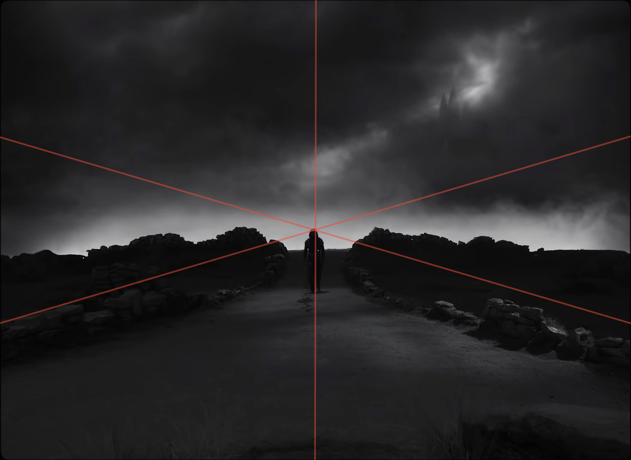 원포인트 숏 예시, 〈맥베스의 비극〉(2021) [출처: YouTube @ Apple TV]