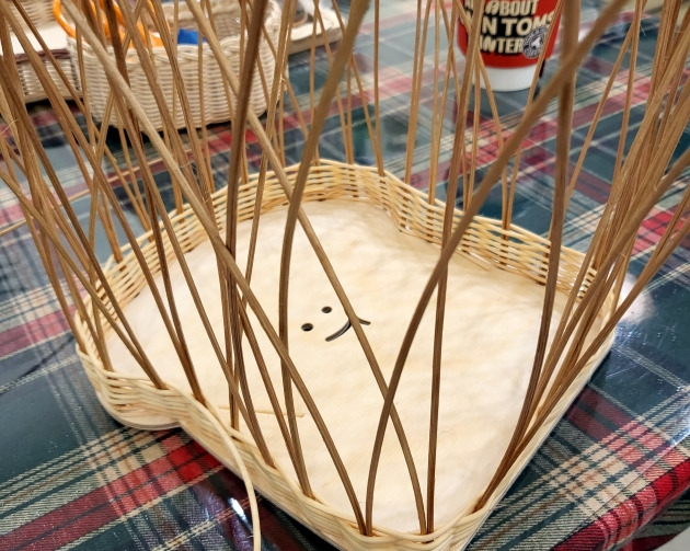 테이블 위에는 라탄(이걸 '환심'이라고 한대), 분무기, 줄자, 송곳, 가위 등 간단한 도구가 세팅되어 있었고, 선생님이 단계별로 차분히 설명해주니 걱정할 것 없어. 라탄은 반복 작업 시간이 꽤 길어. 작품의 원하는 크기나 높이가 될 때까지 반복해서 쌓아주는 구간은 무념무상 쭉쭉 진행하게 돼. 그 외 부분도 처음엔 헷갈리지만, 순서에 맞게 안쪽 바깥쪽을 반복하며 환심을 엮으면 그만.