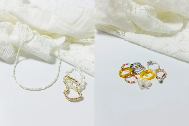 요즘은 비즈반지나 목걸이 등은 물론 스마트폰 스트랩이나 키링 등 엄청 다양하게 만드는데 특히 알록달록한 색감으로 키치한 그 시절 감성을 그대로 살리더라고. 특히 비즈공예에 쓰이는 비즈는 종류가 워낙 많아서 내가 원하는 느낌대로 만들 수 있다는 것도 장점이야.