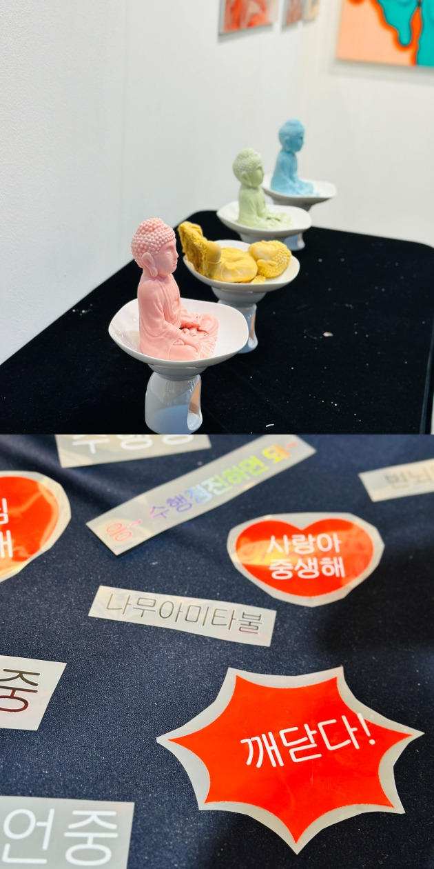 특히 사람들이 몰린 부스가 몇 군데 있었는데, '깨닫다!'와 '응~ 수행 정진하면 돼~'라는 문구가 적힌 티셔츠야. MZ 특유의 키치한 감성을 불교 용어와 매치해 재미와 관심을 유도한 거지! 티셔츠는 바로 완판이 되어서 내가 방문한 토요일에는 주문 신청만 받더라고. 그런데도 부스에 사람이 많아서 제대로 구경하기가 힘들었어.