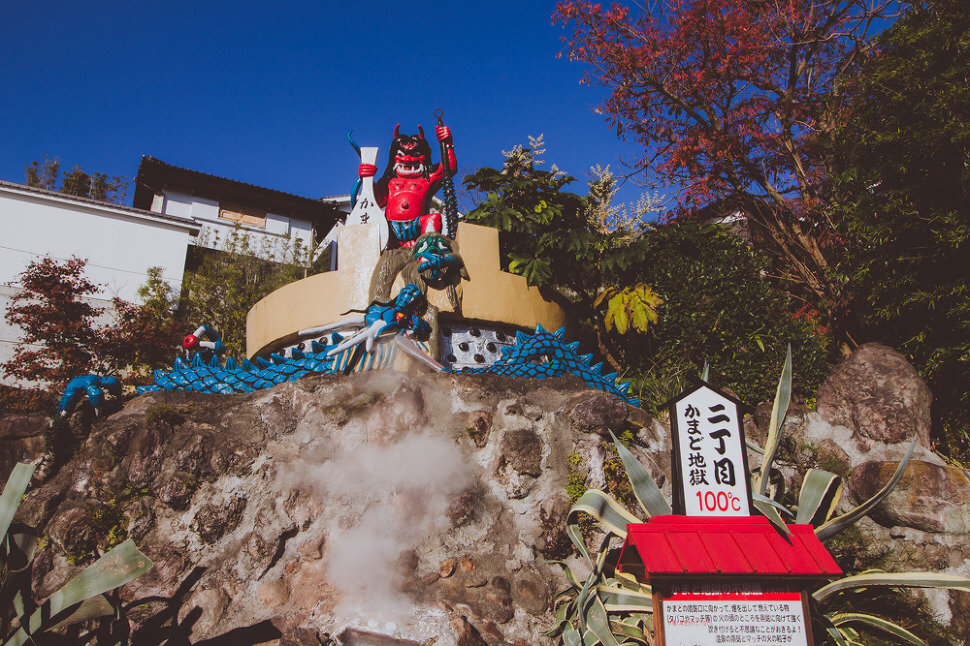 온몸이 불타오르는 듯 붉은 색을 휘감은 무시무시한 형상의 도깨비가 서 있는 모습이 지옥보다는 작은 온천 테마파크 같은 느낌. 이곳에서 나는 온천수는 80~90도. 가마도지옥이 몸을 담그는 온천이 아닌 보기만 하는 온천이라는게 다행인지도 모르겠다.