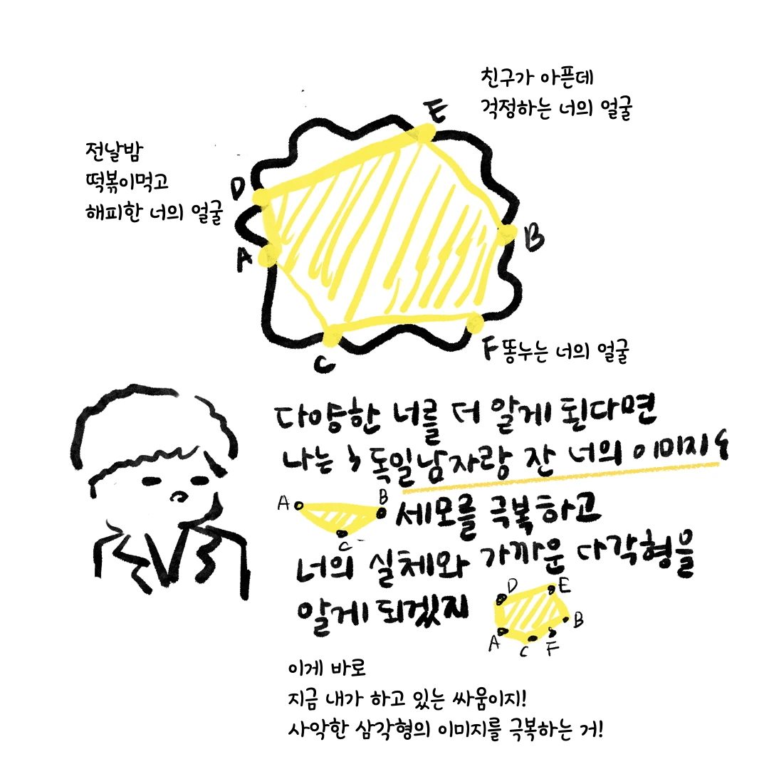 우리의 마음이 무지개라고 하면 사실 그 안에 수억 수조개의 빛의 굴절이 들어있는데 언어는 무지하게도 빨.주.노.초. 파.남.보. 7개의 색깔이라고 뱉어버린다. 모든 것을 말하고 설명하기엔 우리가 갈길이 바쁘고 공간은 한정되어 있으므로. ‘어디가?’라고 말했으면 찰떡같이 대충 흘려듣기를 기대하는 것이다.
