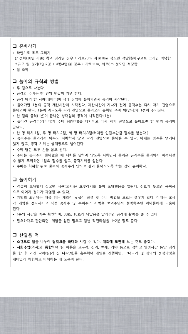 쉬운 규칙의 재미있는 놀이. 모두 손을 잡고 하는 놀이라서 참 좋다. 운영하는 방법에 따라 정말 놀이처럼, 혹은 아주 격하게 할 수 있는 게임이다.