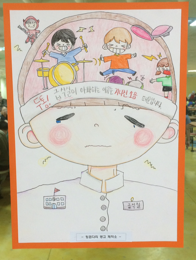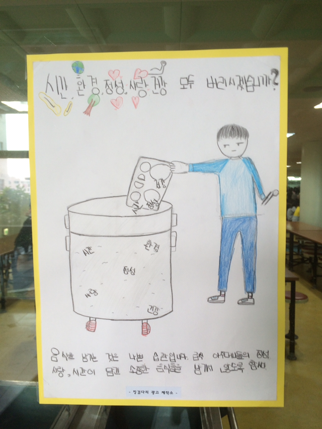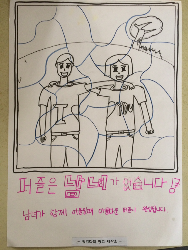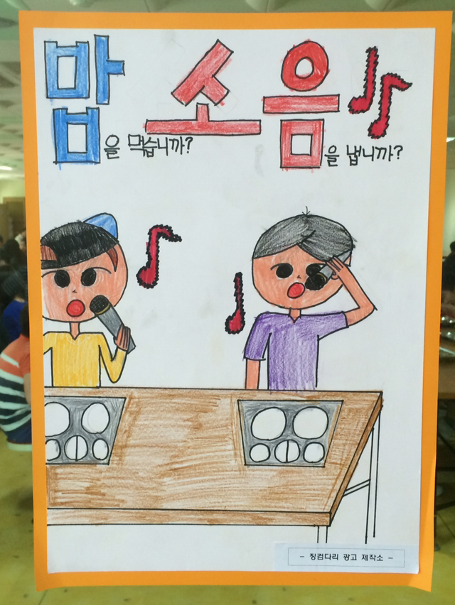 : 아이들은 좋은 아이디어를 가지고 나온다. 함께 이미지와 카피를 고민하고 정리해 간다. 좋은 아이디어는 함께 공유하고 칭찬한다. 아이들이 뿌듯해 한다.