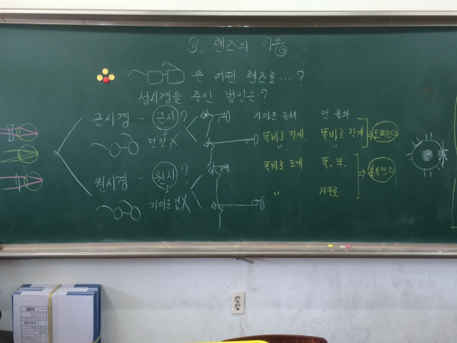 - 오늘 수업에서는 선생님은 아무것도 알려주지 않을거야. 우선 너희들이 해야 할 일은 근시가 뭔지, 원시가 뭔지 알아내야 해. 그리고 전 시간에 공부했던 것처럼 눈과 한뼘거리에서 가까운 물체와 먼 물체를 관찰해봐. 그리고 한 팔 거리에서도 마찬가지로 가까운 물체와 먼 물체를 관찰해봐. 그리고 직접 렌즈도 만져보고 마음껏 관찰해봐.